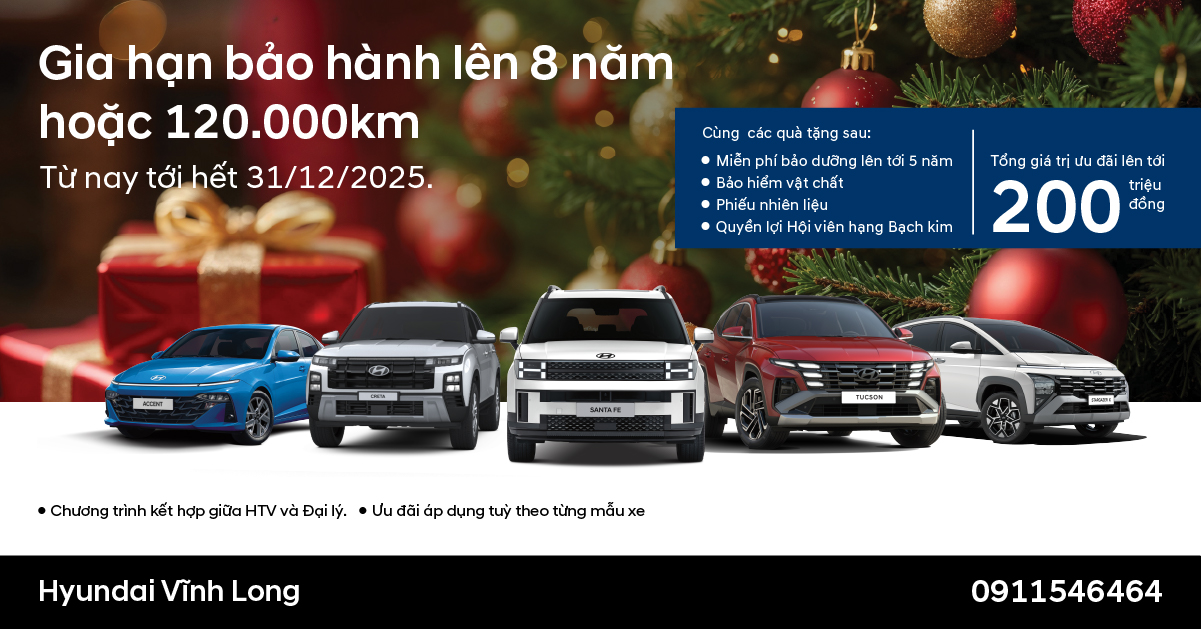 Nhằm tri ân khách hàng cuối năm, Hyundai Vĩnh Long triển khai chương trình ưu đãi đặc biệt với tổng giá trị quà tặng lên đến 200.000.000 đồng cho khách hàng mua xe trong thời gian từ nay đến hết 31/12/2025.