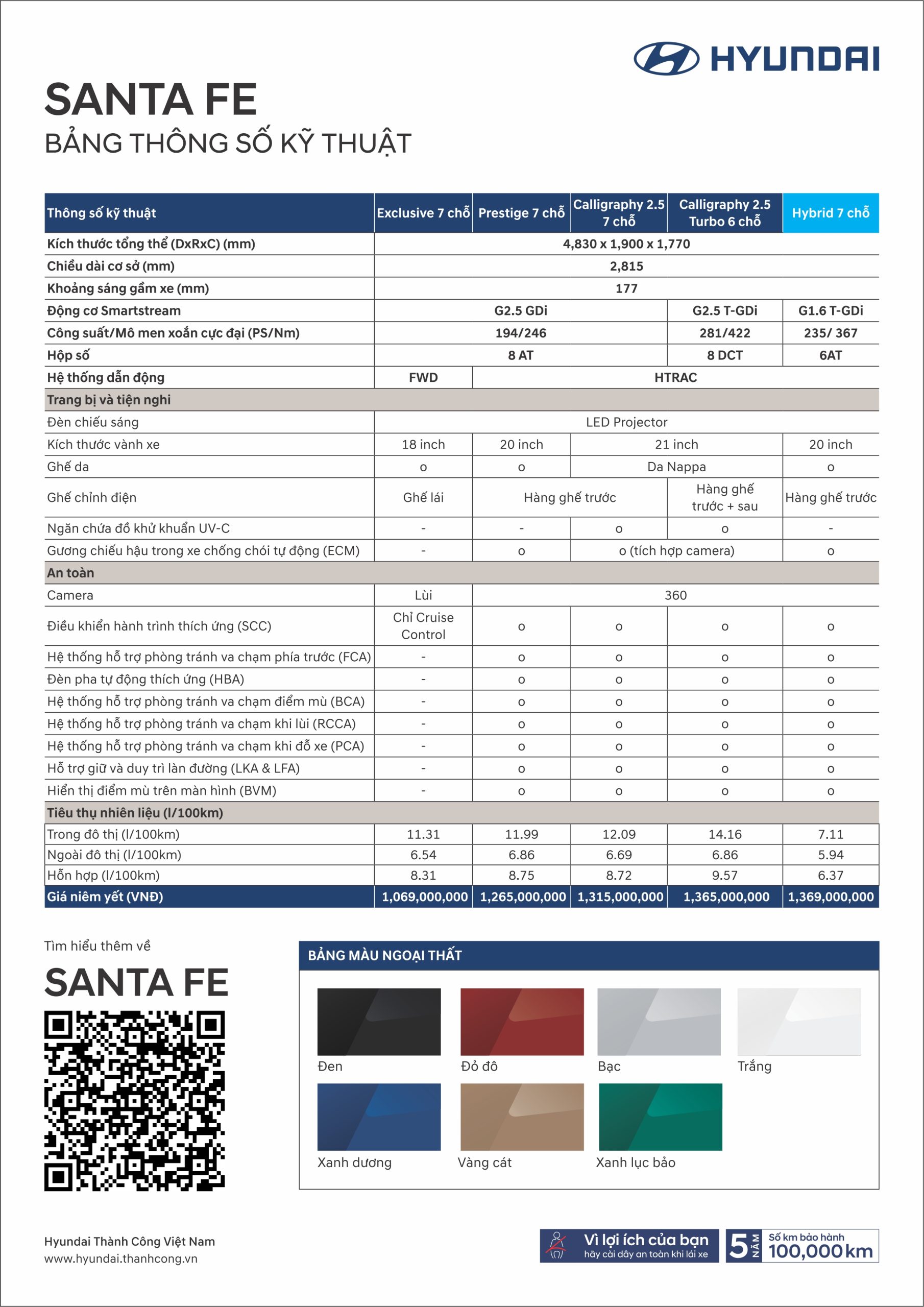 Nhận báo giáHyundai Santa Fe thế hệ thứ 5 được khoác lên mình tổng cộng 7 màu sắc ngoại thất, ngoài các màu phổ biến như trắng, đỏ, đen còn các màu sắc phá các khác như vàng cát, xanh dương, xanh lục bảo.