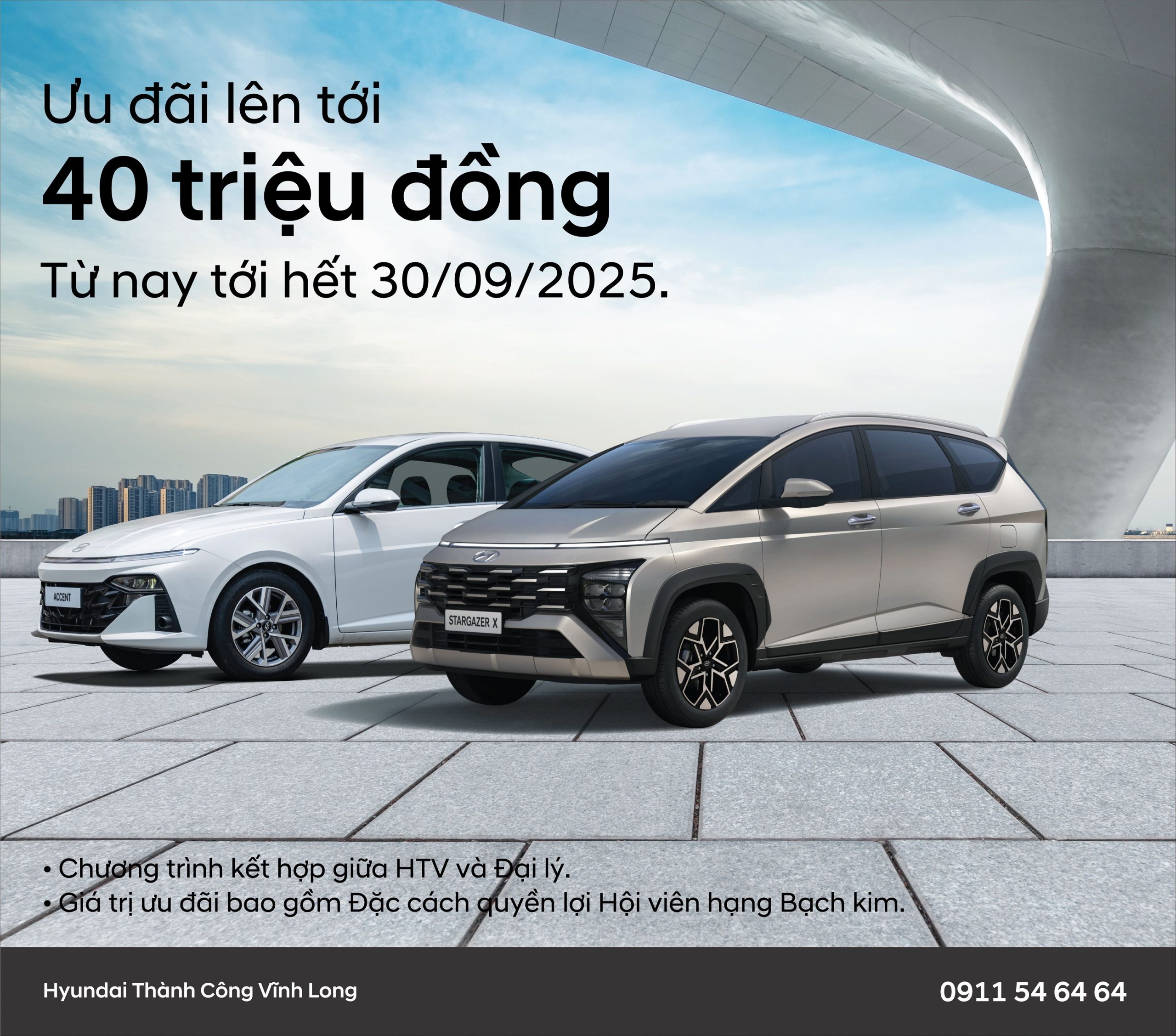 - Hyundai Accent & Hyundai Stargazer: Ưu đãi lên tới 40 triệu đồng – mẫu sedan và MPV được yêu thích, nay giá càng dễ tiếp cận.