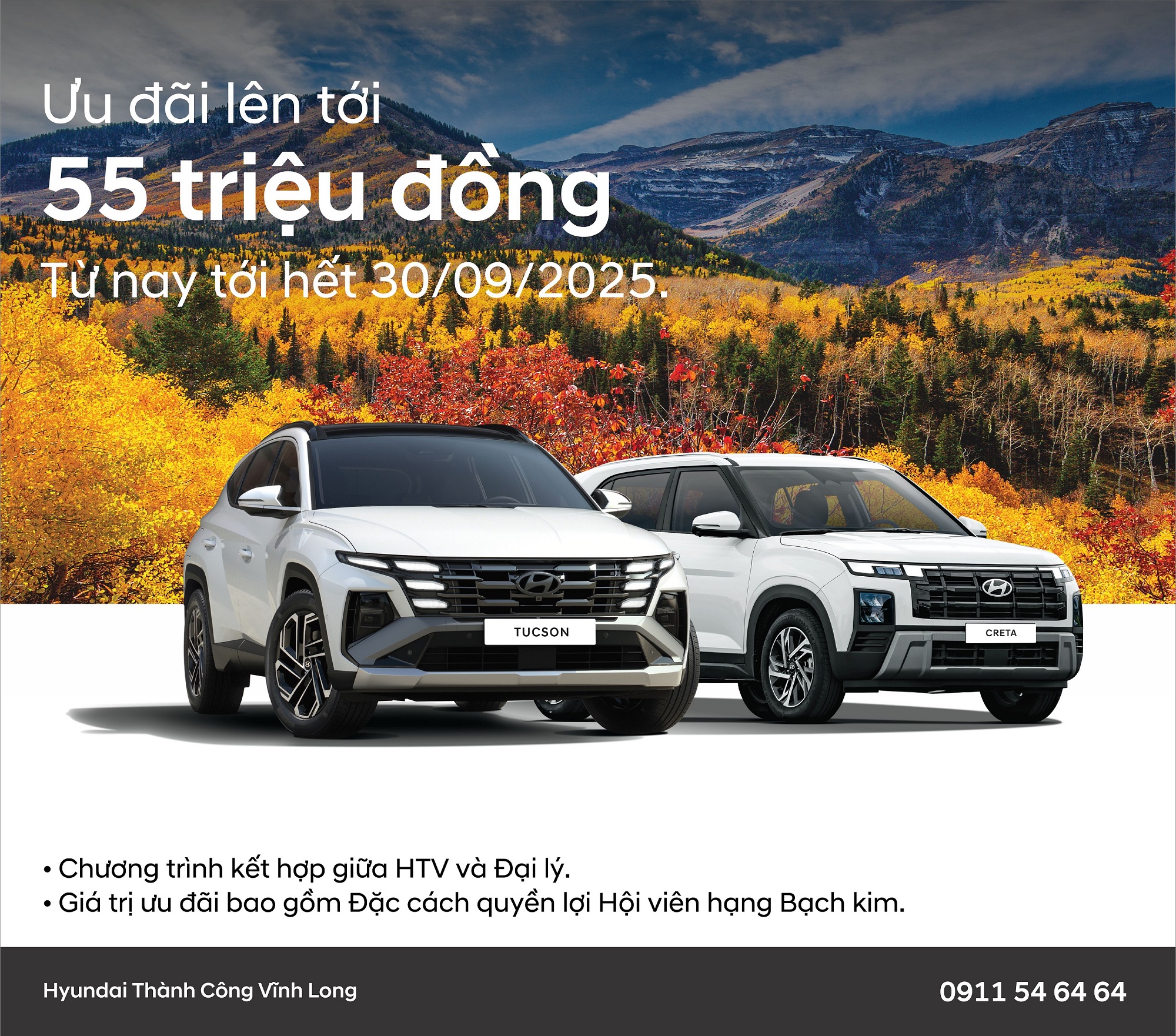 - Hyundai Tucson & Hyundai Creta: Ưu đãi lên tới 55 triệu đồng – SUV phong cách, đa dụng, tiết kiệm chi phí khi sở hữu ngay hôm nay.